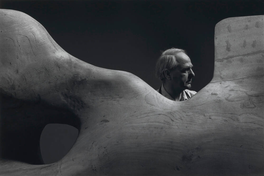DescriptionPortrait of Henry Moore in profile standing behind one of his carved wooden sculptures - an undulating form with a hollowed out void.Copyright© Estate of Arnold Newman