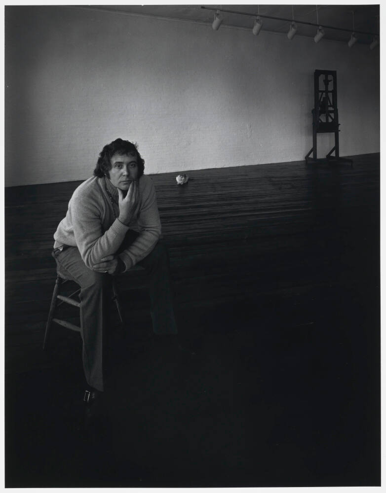 DescriptionPortrait of Robert Indiana seated on stool in room with gallery lights, a wooden easel, and a cat. He's wearing a turtleneck sweater and resting chin on hand.
