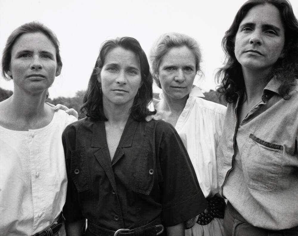 DescriptionPortrait of four sisters standing near one another. Mimi, second from left, stands in front of Bebe while Laurie, far right, stands at an angle with her chin raised. Each one wearing a buttoned up shirt. The tree line is visible in the background and the sky is clear.Copyright© Nicholas Nixon