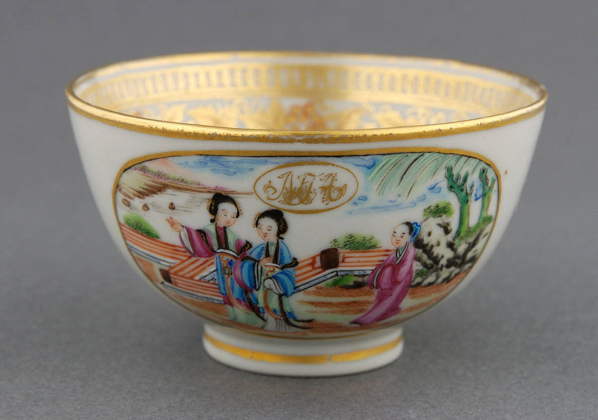 DescriptionPart of 77 piece tea service. In bottom of saucer, on exterior sides of cups is a scene painted in famille-rose style stowing 2 Chinese ladies and attendant in garden. Above figures is gold monogram, MTA (?) in gold oval. On interior sides of all pieces is border design in gold of grape bunches and leaves. On handleless cup on exterior side is also a gold spray of leaves and berries.