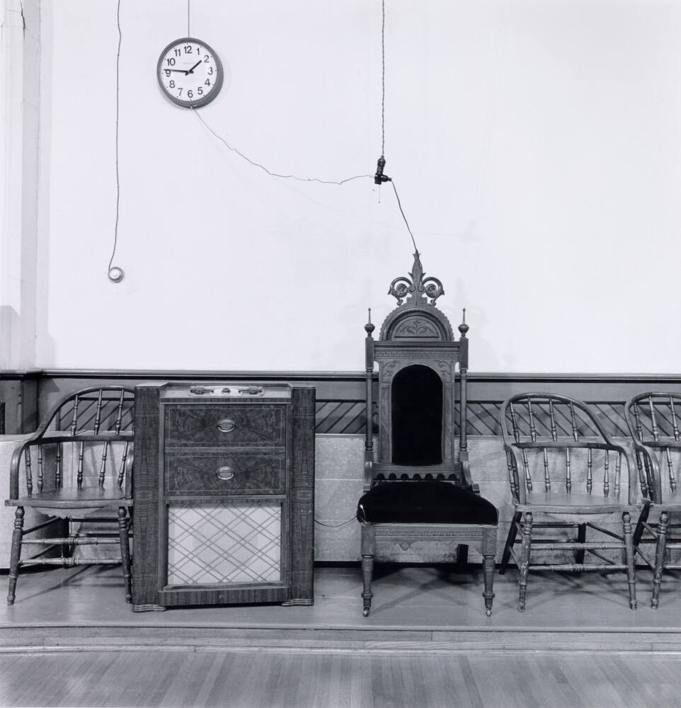 DescriptionImage of interior of room with hardwood floors and row of chairs, one elaborately carved, next to a record player.Copyright© David Plowden