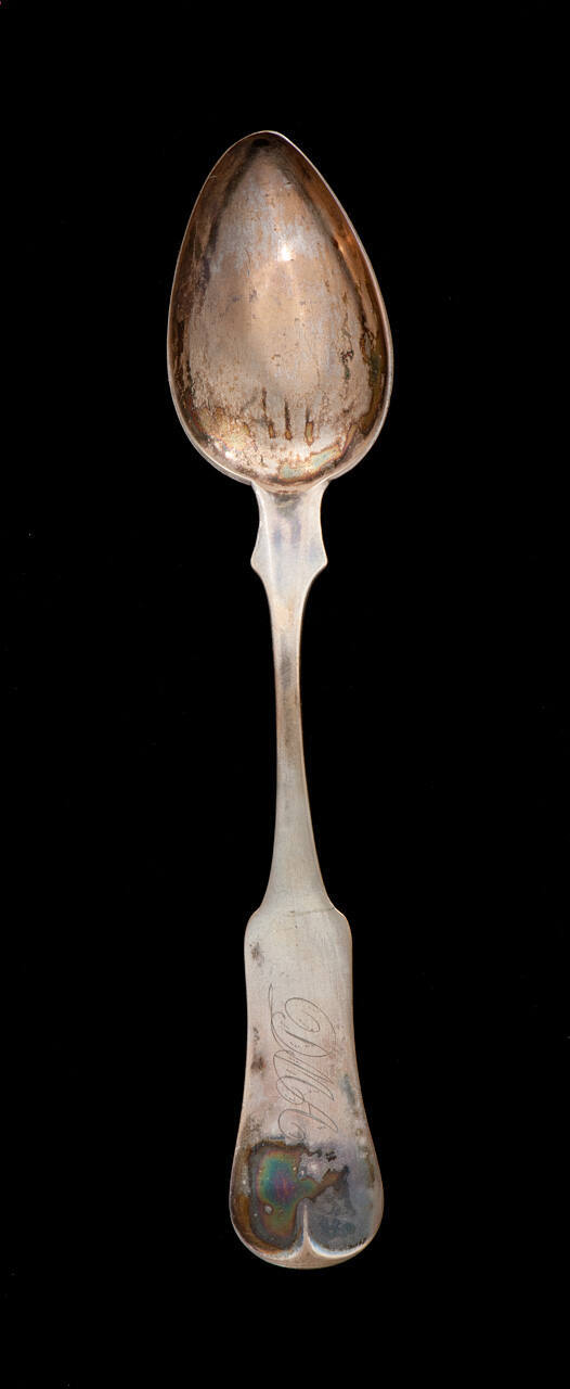 DescriptionLarge silver serving spoon. Fiddle pattern. Engraved with initials in script D.M.A.