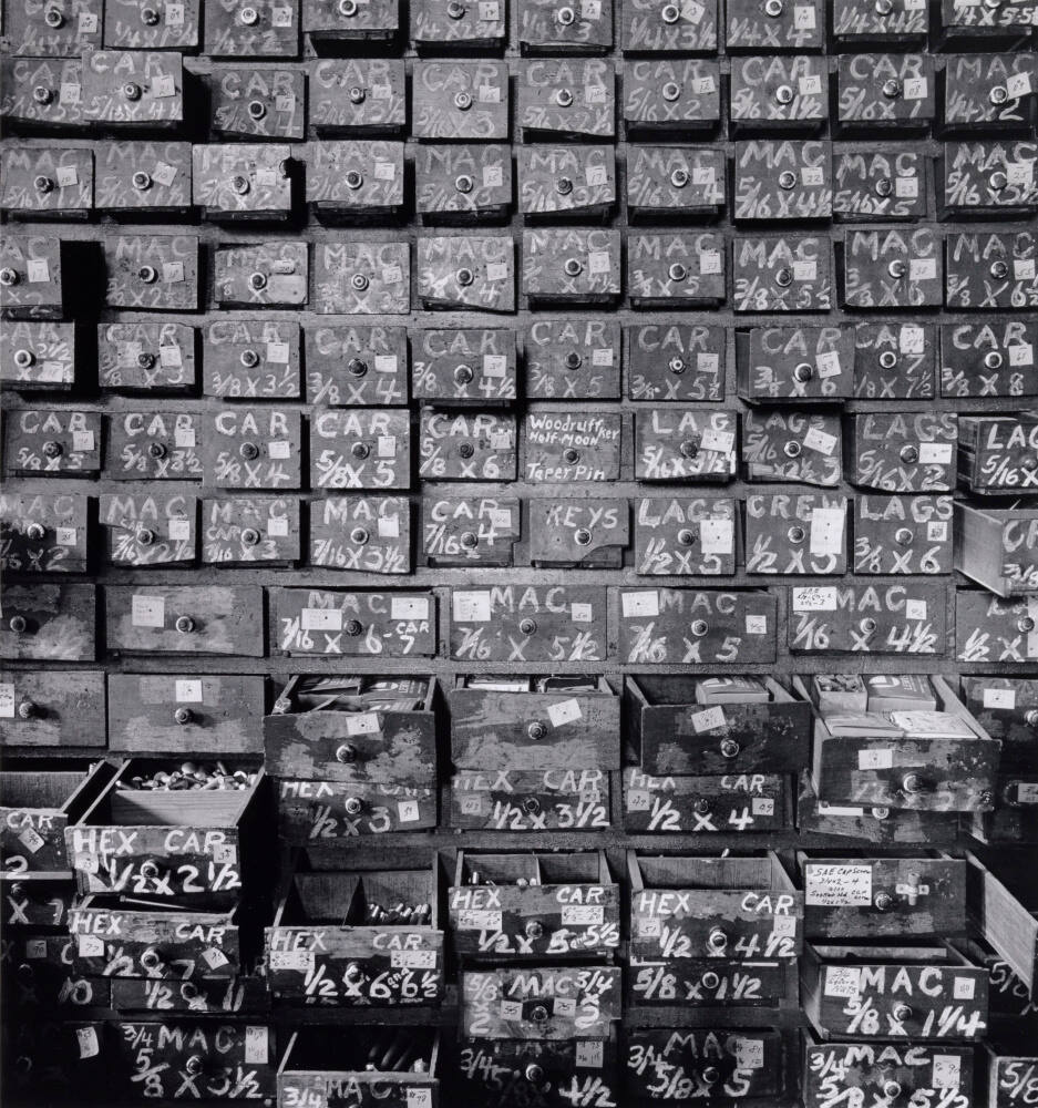 DescriptionImage of tiny wooden drawers labeled and filled with hardware.Copyright© David Plowden