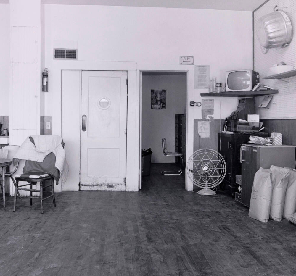 DescriptionInterior image of room with hardwood floors and two doors. In the corner of the room is a television, floor fan, and small refrigerator.Copyright© David Plowden