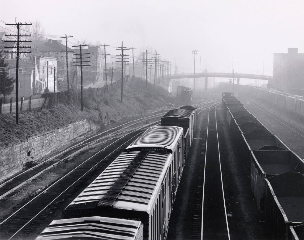 DescriptionImage of freight yard with trains, row of homes and power lines, and bridge barely visible amid fog.Copyright© David Plowden