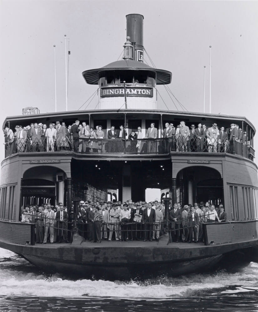 DescriptionImage of ferryboat with crowds of people lined along railing looking out into water. Boat painted to read "BINGHAMPTON"Copyright© David Plowden