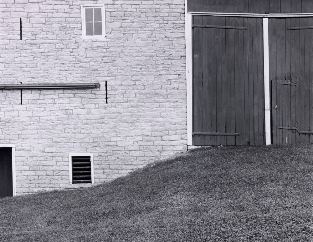 DescriptionImage of side of stone building with barn doors and slopping grassy hill.Copyright© David Plowden