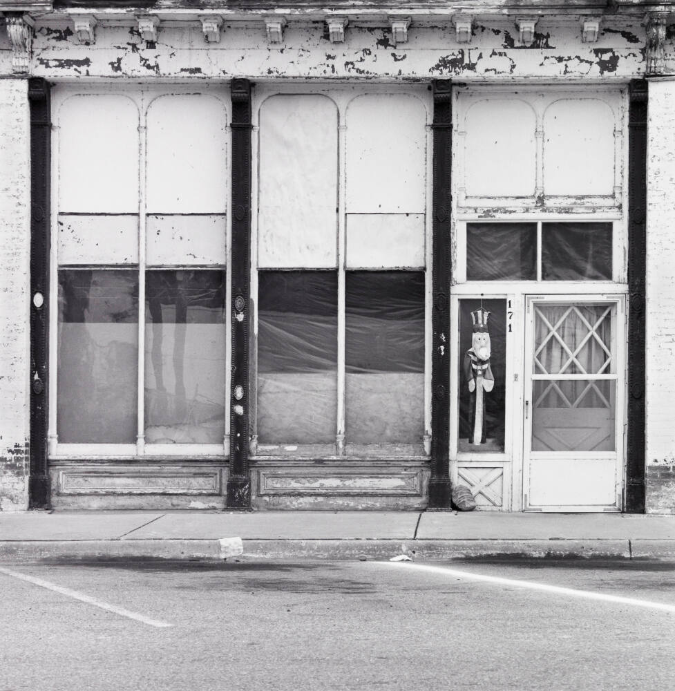 DescriptionImage of building facade with decorative molding, chipping paint, and an Uncle Sam wind sock hanging beside the door numbered 171.Copyright© David Plowden