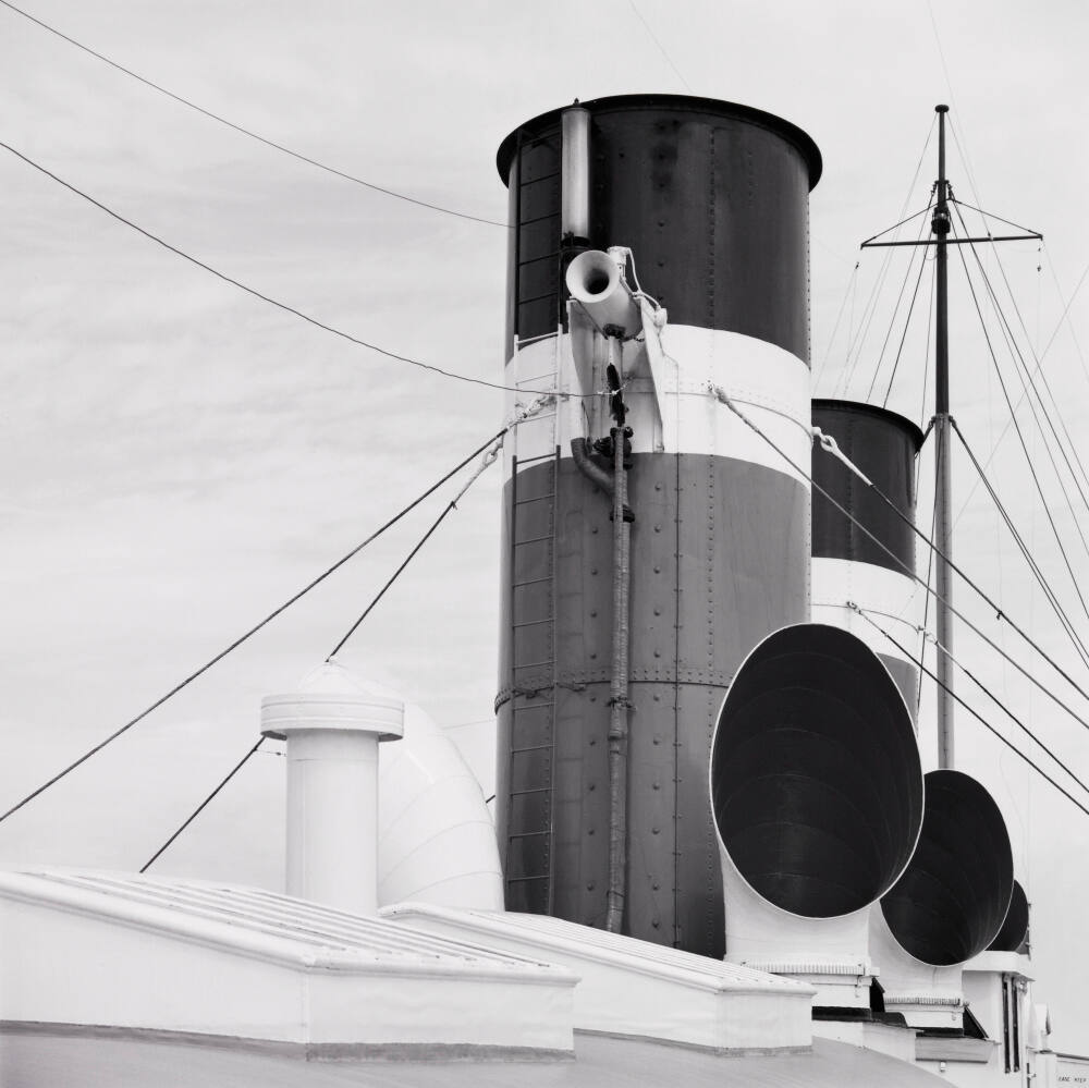 DescriptionDetail image of two smokestacks in front of a pole with numerous cables extending towards the steamship.Copyright© David Plowden