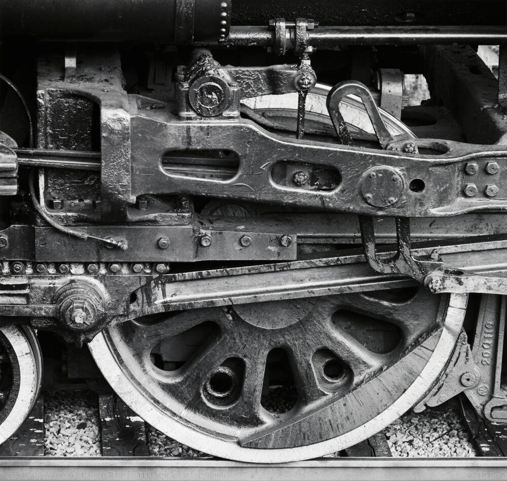 DescriptionDetail image of locomotive crosshead on track with gravel below.Copyright© David Plowden