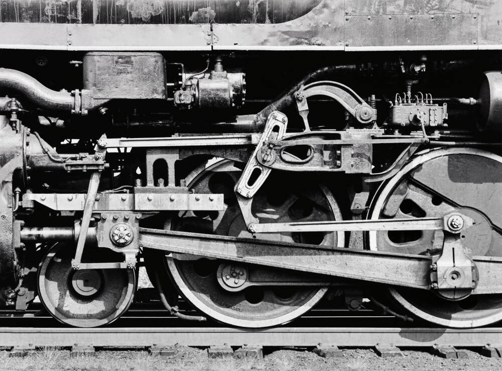 DescriptionDetail image of locomotive's driving wheels and train track with dirt and tufts of grass in foreground.Copyright© David Plowden