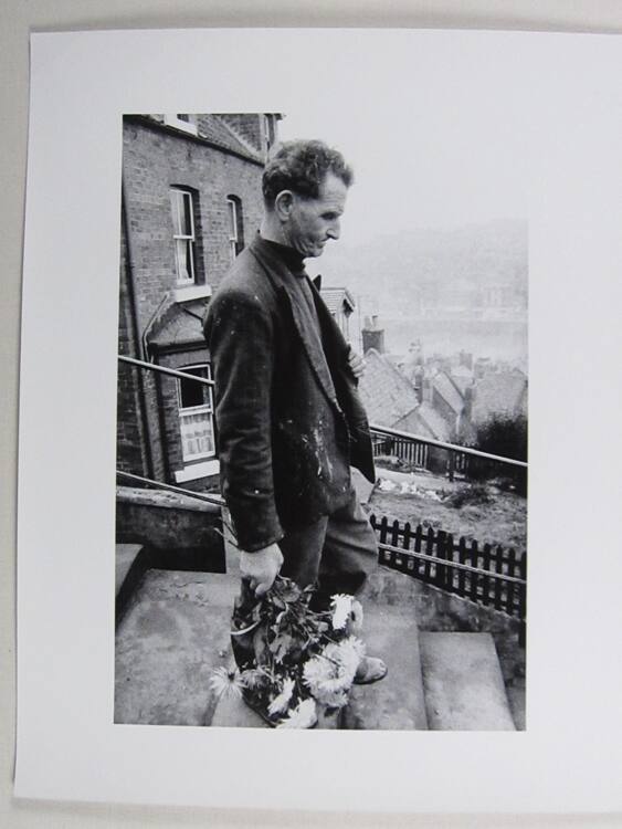 DescriptionImage of man wearing tattered jacket descending concrete steps carrying flowers. The stairway runs next to a brick two-story home with a picket fence.Copyright© Bruce Davidson/Magnum Photos