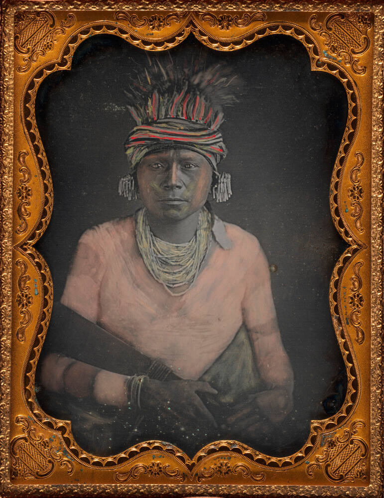 DescriptionHand painted portrait of a Plains Indian wearing strings of beads around his neck, ear ornaments, and a decorated headdress. This half plate daguerreotype is housed in a brass mat with a red velvet liner inside of a leather-covered case with decorative motif.Provenance