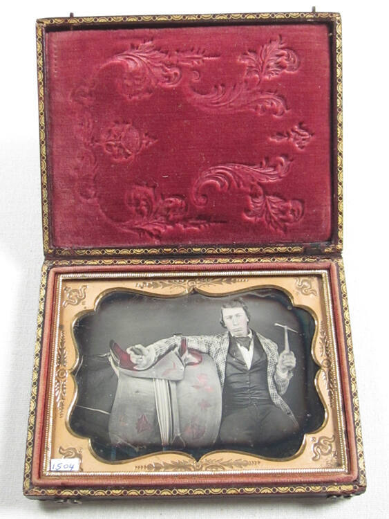 DescriptionQuarter plate cased handcolored daguerreotype housed in decorative brass mat with red velvet liner. Image of saddle maker seated, resting arm on decorated saddle, and holding tools of the trade (tack hammer held in air with left hand). He is well-dressed in a vest, tie and patterned jacket.