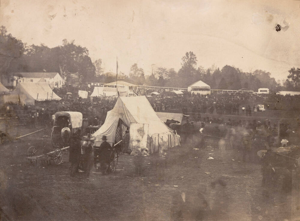 DescriptionImage of crowd gathered in field with tents set up. In the foreground there is a horse, covered wagon, and blurred figures.ProvenanceThe Hall Family Foundation, Kansas City, MO, 2015;