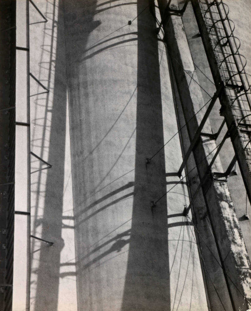 DescriptionImage of a tall cylindrical structure with stark linear shadows intersecting across the facade.Copyright© The Ralston Crawford Estate