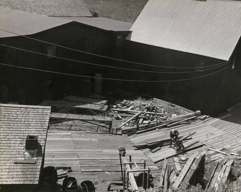 DescriptionImage of man wearing hard hat sawing a board on a wooden platform. Numerous intersecting rooflines are in the background.Copyright© The Ralston Crawford Estate