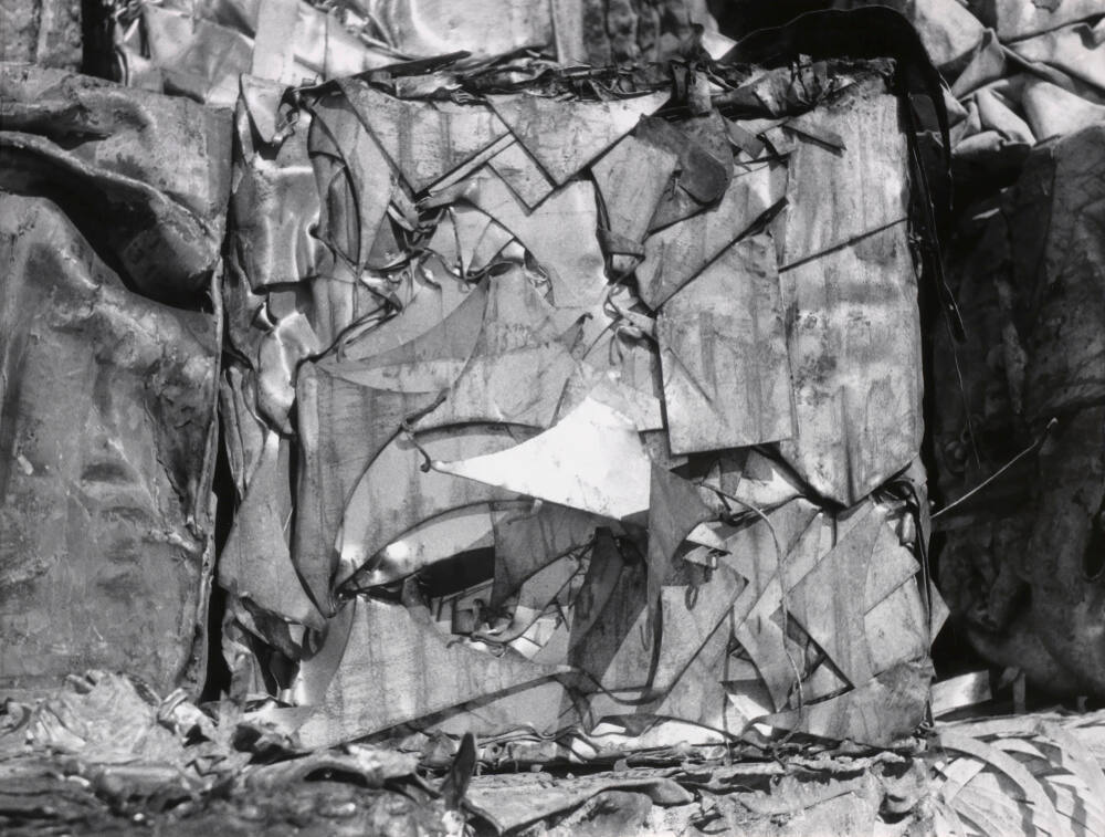 DescriptionImage of overlapping metal scraps pressed together forming a cube.Copyright© The Ralston Crawford Estate