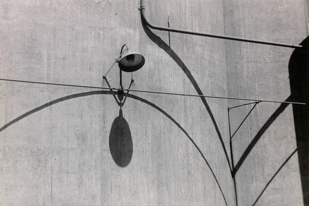 DescriptionImage of the side of a concrete structure; an exterior light is mounted near the center and shadows from the pipes project stark lines on the surface.Copyright© The Ralston Crawford Estate