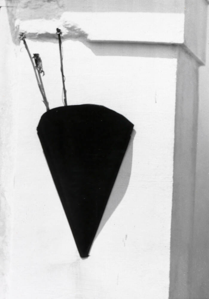 DescriptionImage of a dark conical vessel tethered to a wall.Copyright© The Ralston Crawford Estate