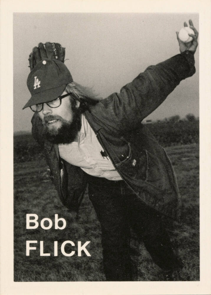 DescriptionIndividual "trading card" with portrait of Bob Flick wearing baseball cap, glove, glasses, and shirt with pens in the pocket. He's leaning forward with his arms out stretched behind him.
