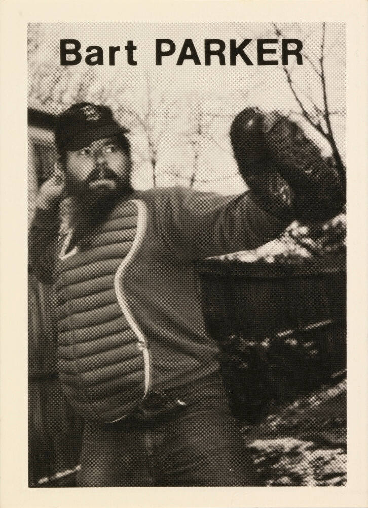 Statistics and quote by respective artist printed on card verso, in black: "Height: 5’ 2” / Weight: 185 / Born: Pascagoula, Miss. / Home: East side / Throws: Forward/ Bats: Both-either FP: Sun.Chicago Trib. / FC: Noisey FF: Yng.Frankenstein / FD: La Froige’s / FPh: Gina Lollabrigida / Bart Parker / An old photographer retired to his / farm, where he found a baseball in / his field. He plowed it under. / “I believe everything.” / --Henry Miller"