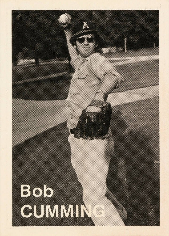 Statistics and quote by respective artist printed on card verso, in black: "Height: 6’ 2”/ Weight: 180 / Born: Worcester, Mass. / Home: Orange, Ca. / Throws: Right / Bats: Right FP: Agfa #3 / FC: 8X10 View FF: Tri-X / FD: D-76 / FPh: / Bob Cumming / When I was in 6th grade, I wanted / like Hell to be in Little League and / used to practice every day with my / friends. They formed a team finally, / and I missed the geographic cut-off / area by one black. All my friends / made it. It was one of those really / critical adolescent failures, and I / never played baseball again, to this / day. I think it is one of the dull- / est, pointless exercised in the world / of sports…eclipsed only by the / game of solitaire. "
