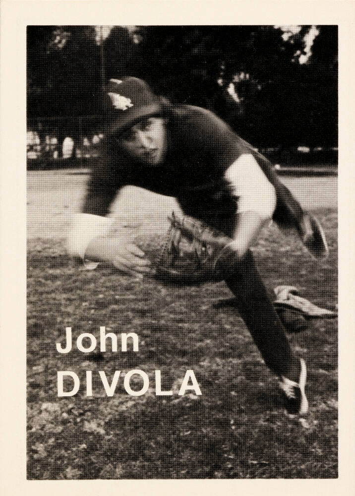 Statistics and quote by respective artist printed on card verso, in black: "Height: 6’ 1”/ Weight: 175 / Born: Santa Monica, Ca. / Home: Venice, Ca. / Throws: Right / Bats: Right FP: Agfa / FC: 2 ¼ FF: Plus-X / FD: D-76 / FPh: Evans / John Divola / Statements are hard to make."