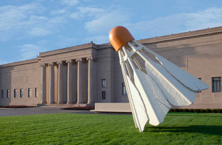 In 1994, the Nelson-Atkins Museum of Art commissioned Claes Oldenburg and Coosje van Bruggen to make a contemporary artwork specifically for the lawn. Oldenburg and van Bruggen often created monuments from seemingly popular objects. Frozen in a continuous game, the four Shuttlecocks offer a playful invitation to visitors to experience the museum as a place for fun and creativity.