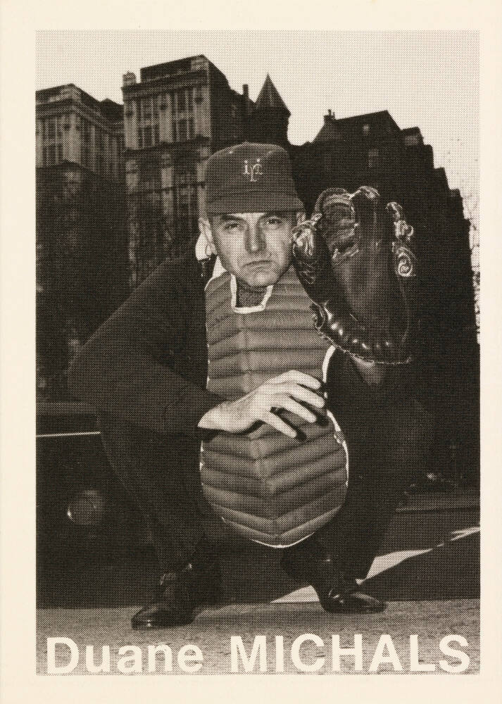 Statistics and quote by respective artist printed on card verso, in black: "Height: 5’ 7” / Weight: 145 / Born: McKeesport Pa. / Home: N.Y.C. / Throws: Right / Bats: Right FP: No favorites / FC: Nikon FF: “ / FD: / FPh: Robert Frank / Duane Michals / In high school I formed the McKees- / port Greyhounds – softball – I got / to play first base because I formed / the team. We were terrible."