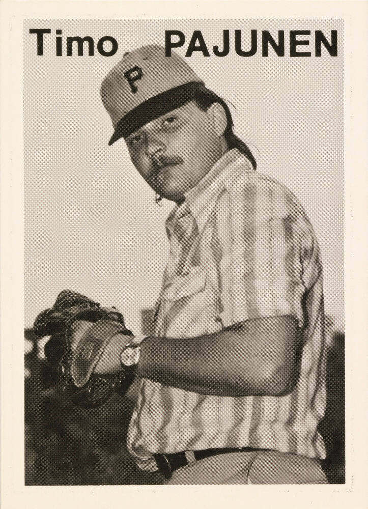 DescriptionIndividual "trading card" with portrait of Timo Pajunen with mustache, baseball cap, and glove.