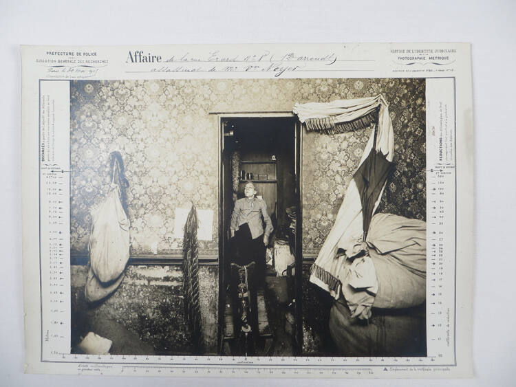 InscribedOn mount recto, top, printed in black ink: "PREFECTURE DE POLICE / DIRECTION GENERALE DES RECHERCHES / Paris le 30 Mai 1905 / Orientation de l'axe optique , Affaire de la rue Erard no 8 (12 arroudt) / assassinat de Mme Vve [?] Noyer , SERVICE DE L'IDENTITE JUDICIAIRE / PHOTOGRAPHIE METRIQUE";