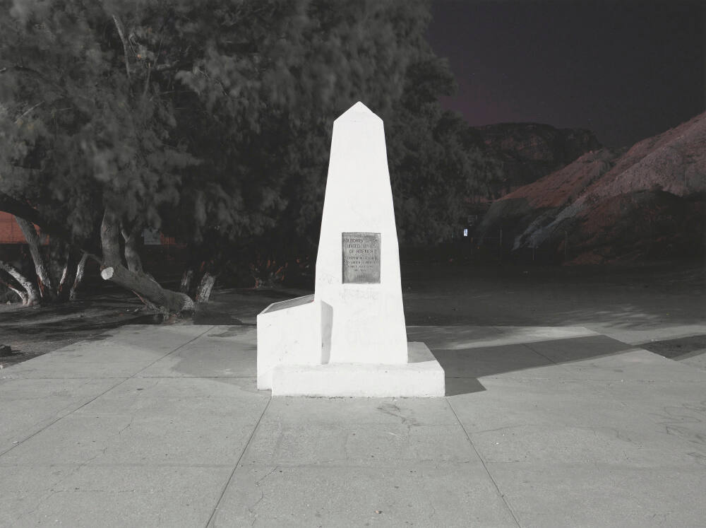 DescriptionOne of 276 views of the United States-Mexico border included in portfolio. Image of stone obelisk with plaque reading "BOUNDARY OF THE UNITED STATES OF AMERICA INTERNATIONAL BOUNDARY AND WATER COMMISSION BEWEEN UNITED STATES AND MEXICO 1989" installed in middle of concrete pad next to tree blowing in wind and mountains behind chain link fence.South view. Common boundary of Chihuahua, New Mexico and Texas near El Paso.