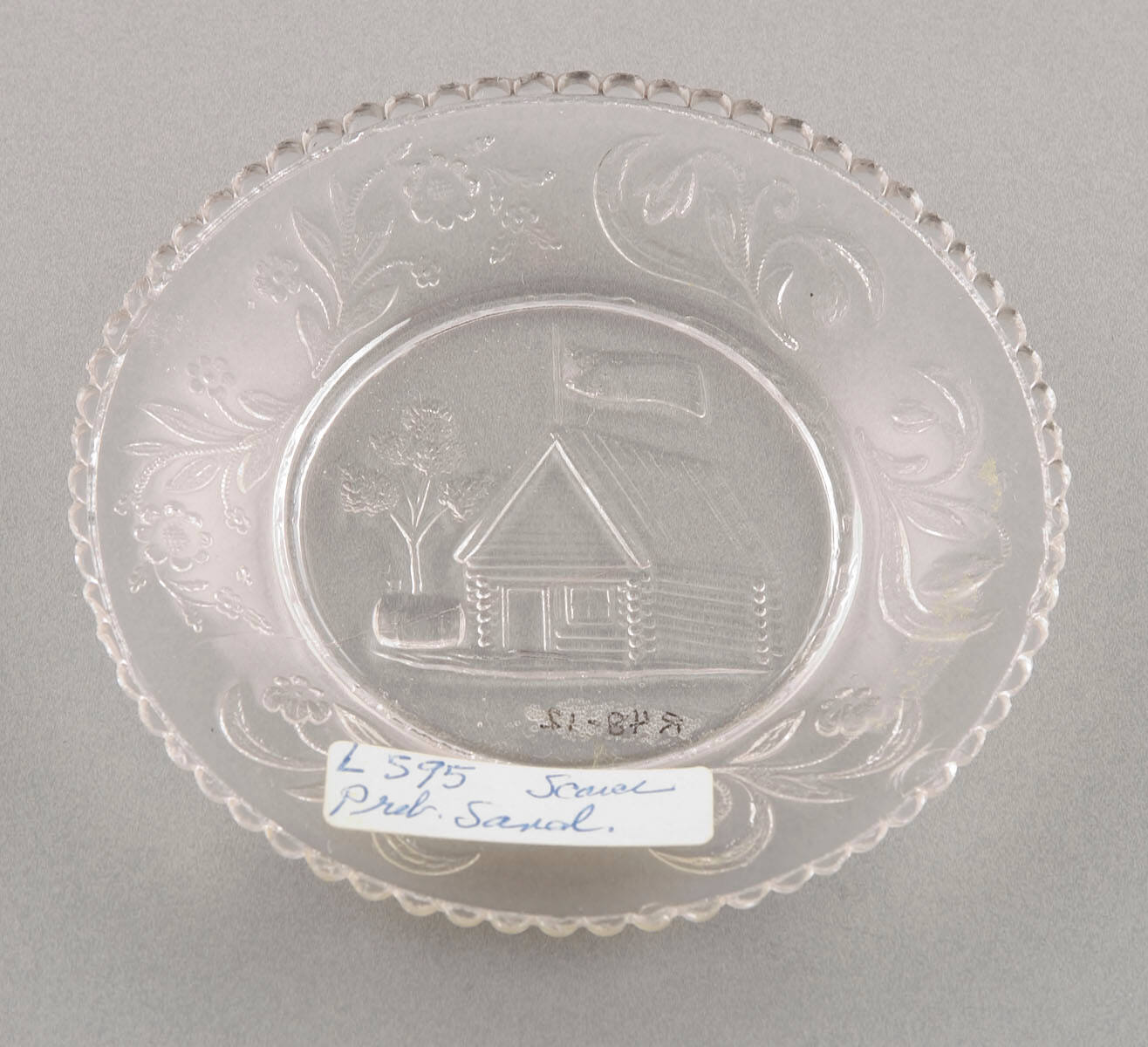 DescriptionLog cabin pattern. 66 even scallops. Cabin door has no planking or latchstring. Stippled vine on shoulder. R-595.