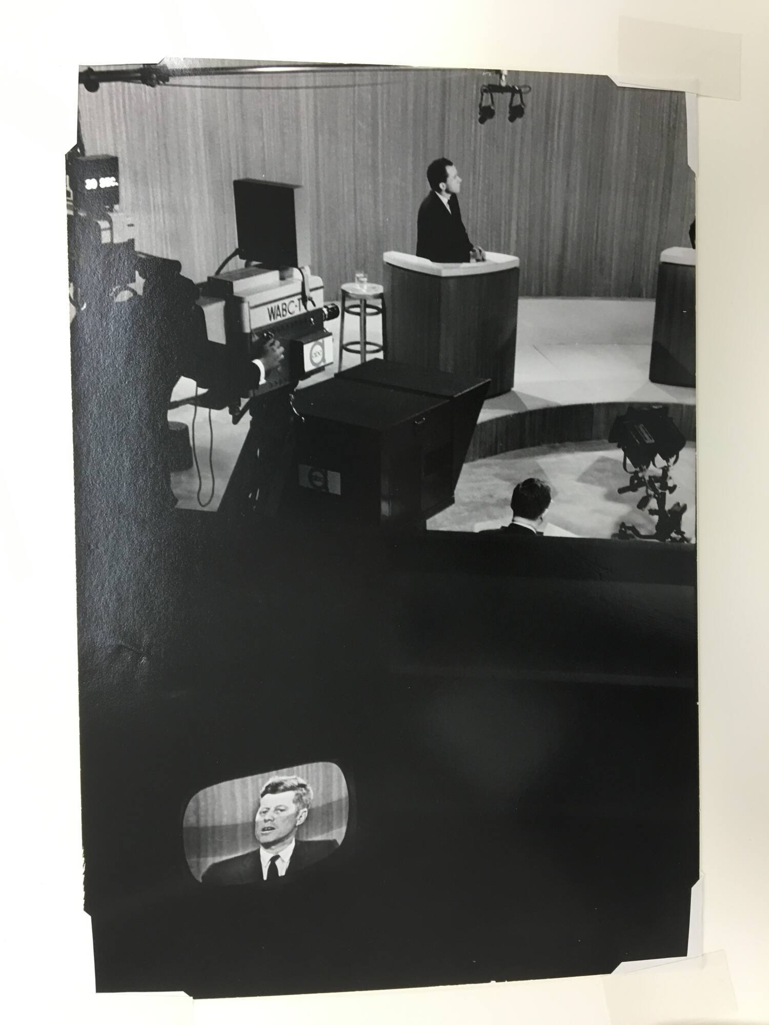 On sheet verso, bottom, blue stamp: "LIFE MAGAZINE / LIFE PHOTO BY / JOE SCHERSCHEL / Property of Life Magazine / Reproduction Forbidden without Express Consent / TAKE No. / 3rd / DATE: / 10-21-60 / SET NO. / 61074 / STORY & LOCATION / NIXON / REPORTER / DEPT. / NO. OF PRINTS / BLACK & WHITE FILM / COLOR FILM / 35 mm 17 / 120 / PACK / CUT / 35 mm / 120 / CUT";