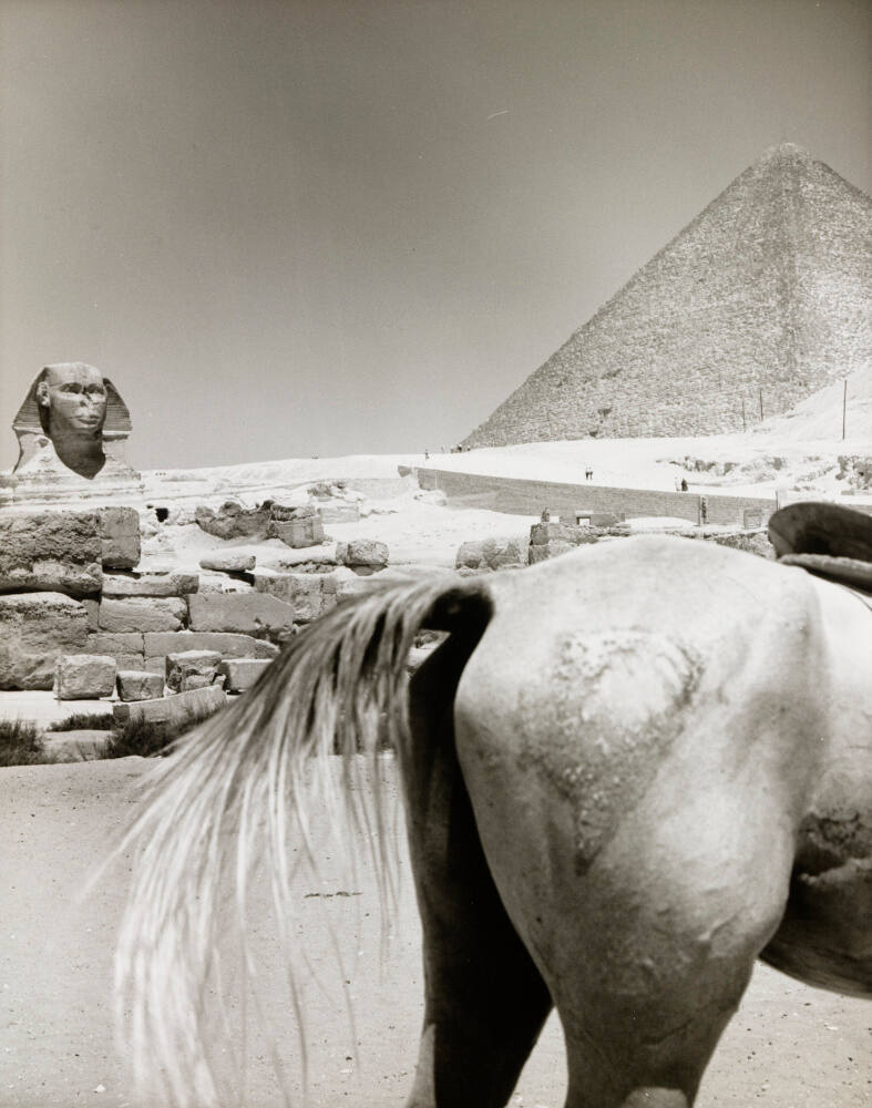 DescriptionImage of horse's hindquarters and tail with sphinx and pyramid in background.Gallery LabelVivian Maier took this curious photograph while vacationing in Egypt in 1959. Foregrounding the rear of a horse rather than the Great Sphinx of Giza in the distance, Maier reveals her sense of humor and a talent for composing unexpected juxtapositions.