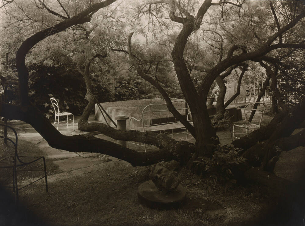 DescriptionImage of a large tree with thick sprawling branches. Beneath the tree rests the head of a stone sculpture. The tree overlooks a small courtyard with iron chairs, a bench, and lush foilage. An above ground rectangular structure, possibly filled with water, is in the center of the courtyard.Provenancewith Howard Greenberg Gallery, New York, NY;