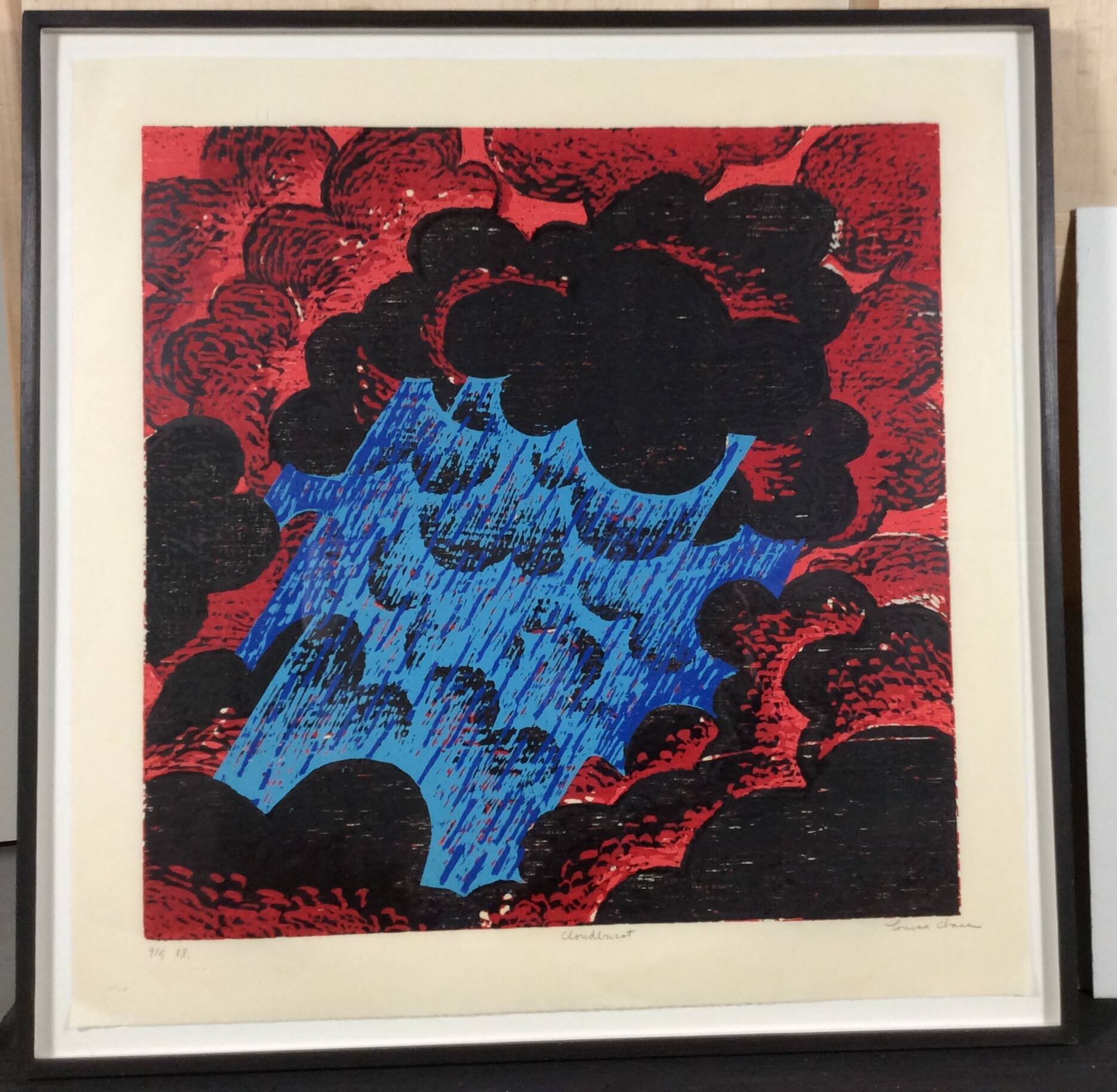 DescriptionIn the upper center right, round black clouds release a torrent of blue rain flowing diagonally toward the lower left corner. The cloudburst is completely encircled by roiling red shapes. The entire composition is rendered in a semi-abstract style.Copyright© Estate of Louisa Chase / Hirschl & Adler Modern, New York