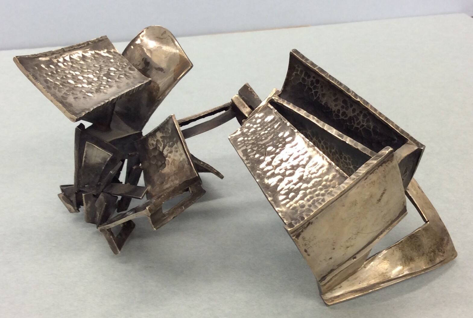 DescriptionComposed of two parts made of sterling silver, the sculpture is fabricated from forged and silver square metal sheets soldered together in clusters. One section is made of larger sheets, which would rest on the clavicle near the neck. Smaller squares and rectangular sheets create a heavy cluster on which would sit on top of the shoulder, near the blade. There is a two-pronged pin used to fasten the brooch to the wearer’s garment.ProvenanceThe artist, Pittsburg, KS, 1968-2016;