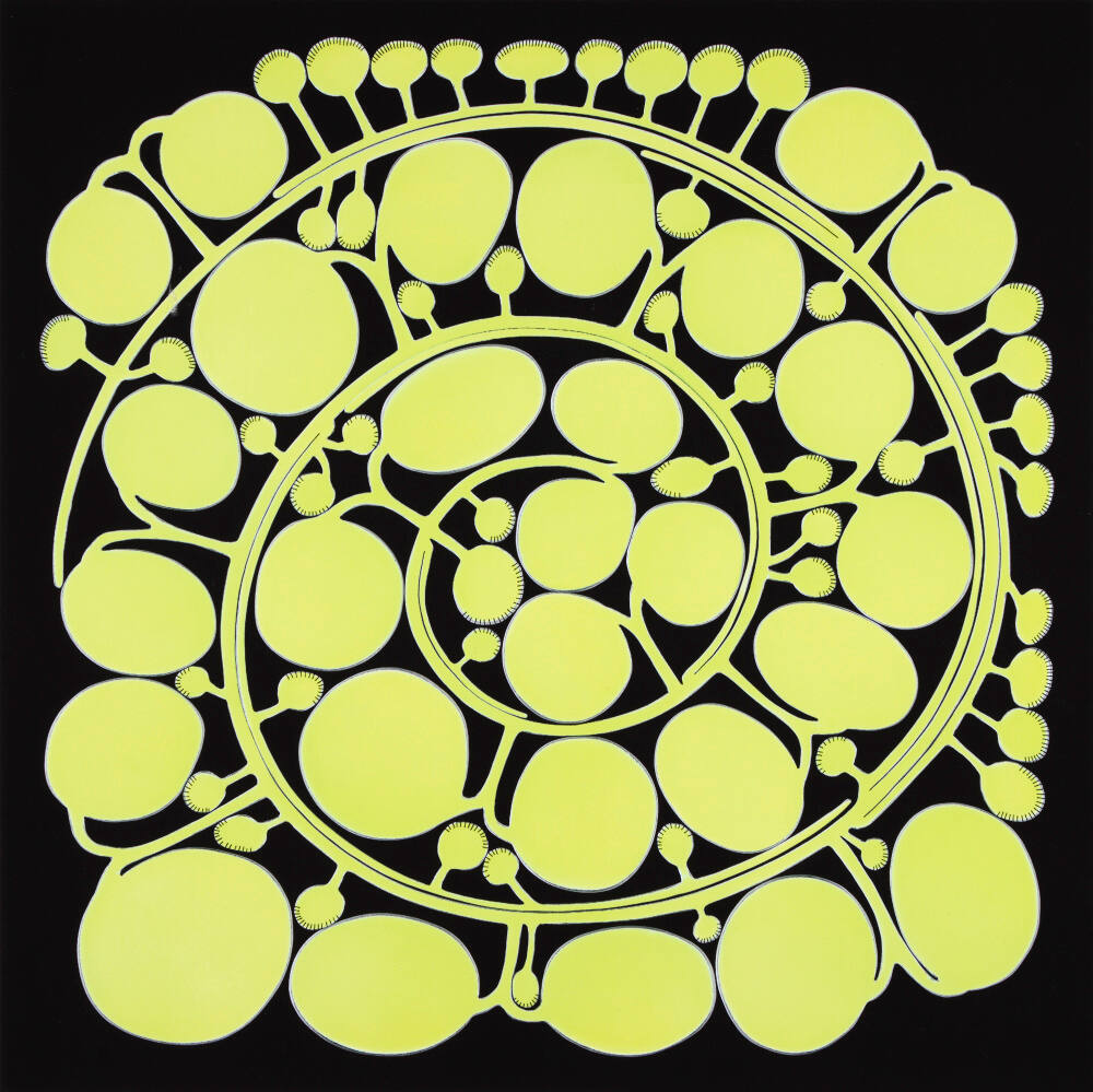 DescriptionThis work on paper displays a square inkjet print of a spiral pattern of neon yellow-green “leaves” on a black background. The print is on white paper. It is an image of a scan of the cut out powder coated metal shape of a tiara prior to folding it into a three-dimensional object.ProvenanceThe artist, Potsdam, Germany, 2015;