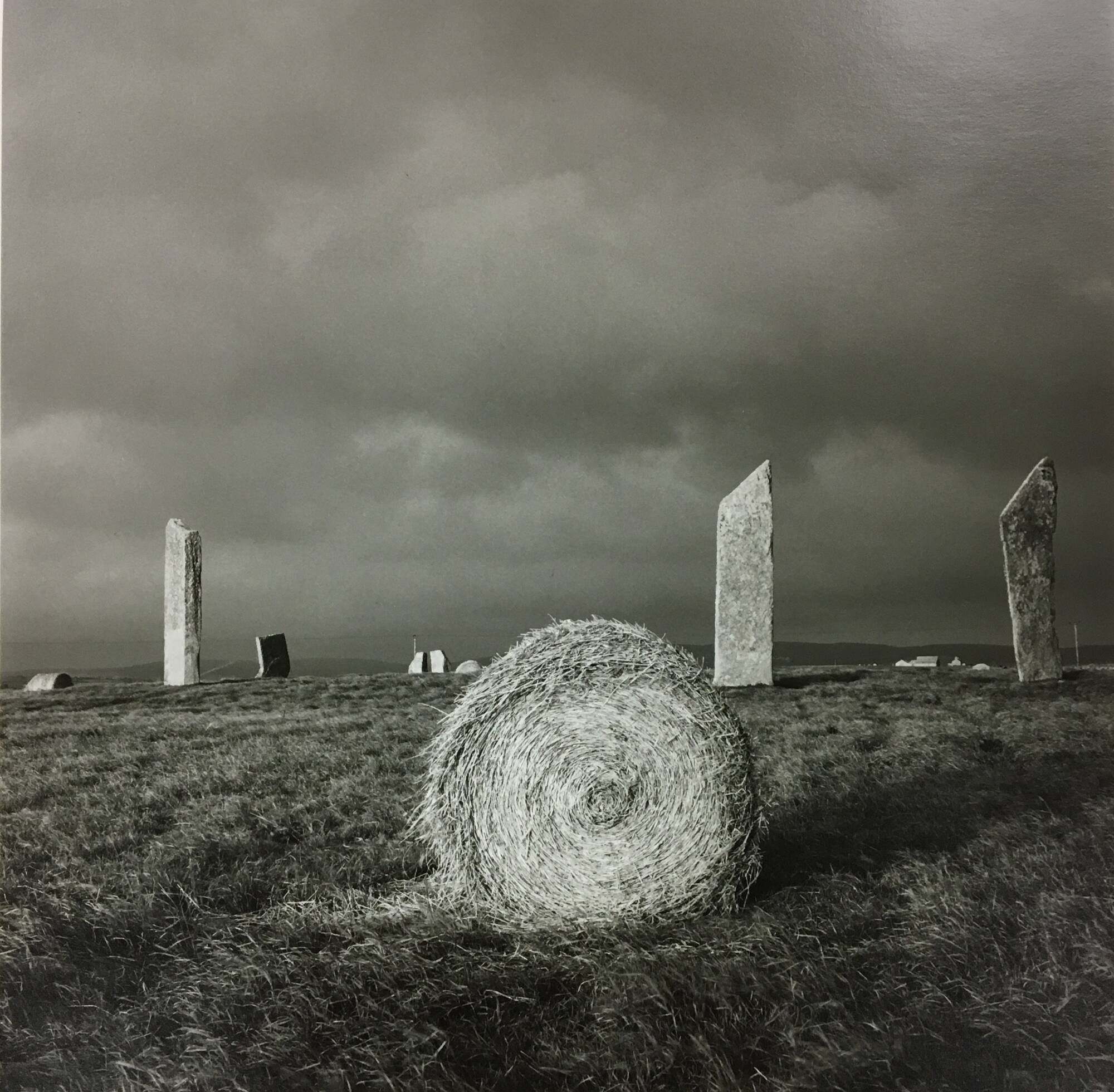 DescriptionImage of a hay bale in center of field with tall, narrow stones scattered in the landscape behind. Soft clouds fill the gray sky above.ProvenanceThe Hall Family Foundation, Kansas City, MO, 2016;