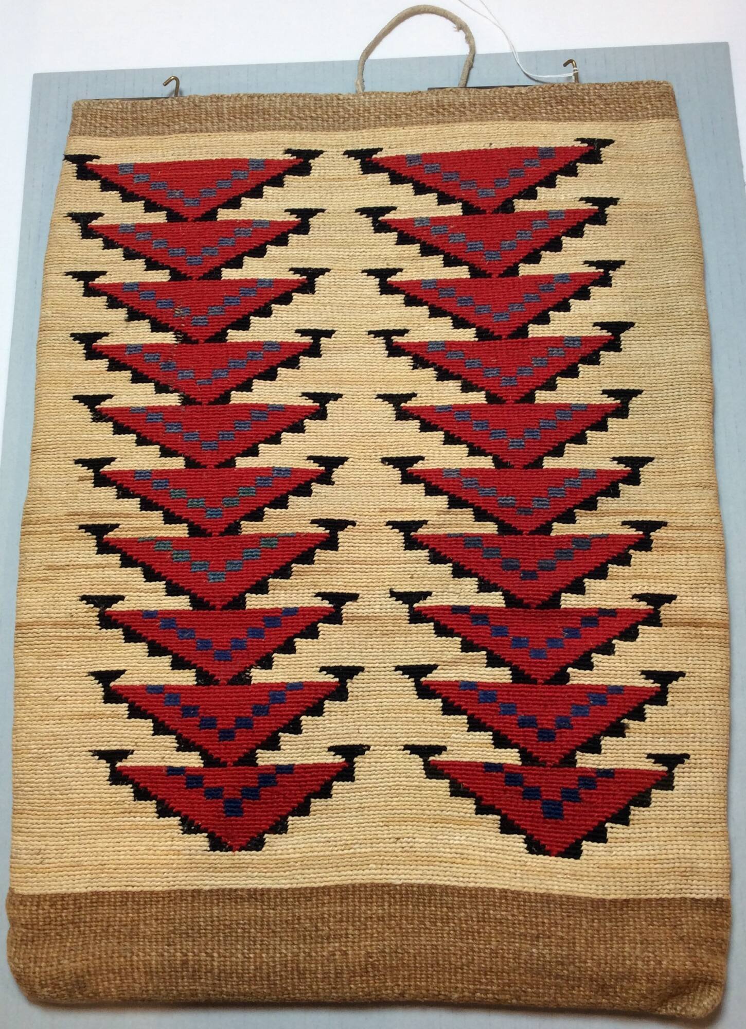 DescriptionRectangular, flat woven bag with differing geometric designs on each side; multiple bright color against tan background.ProvenanceMr. and Mrs. Peter Gattermeir, Kansas City, MO;