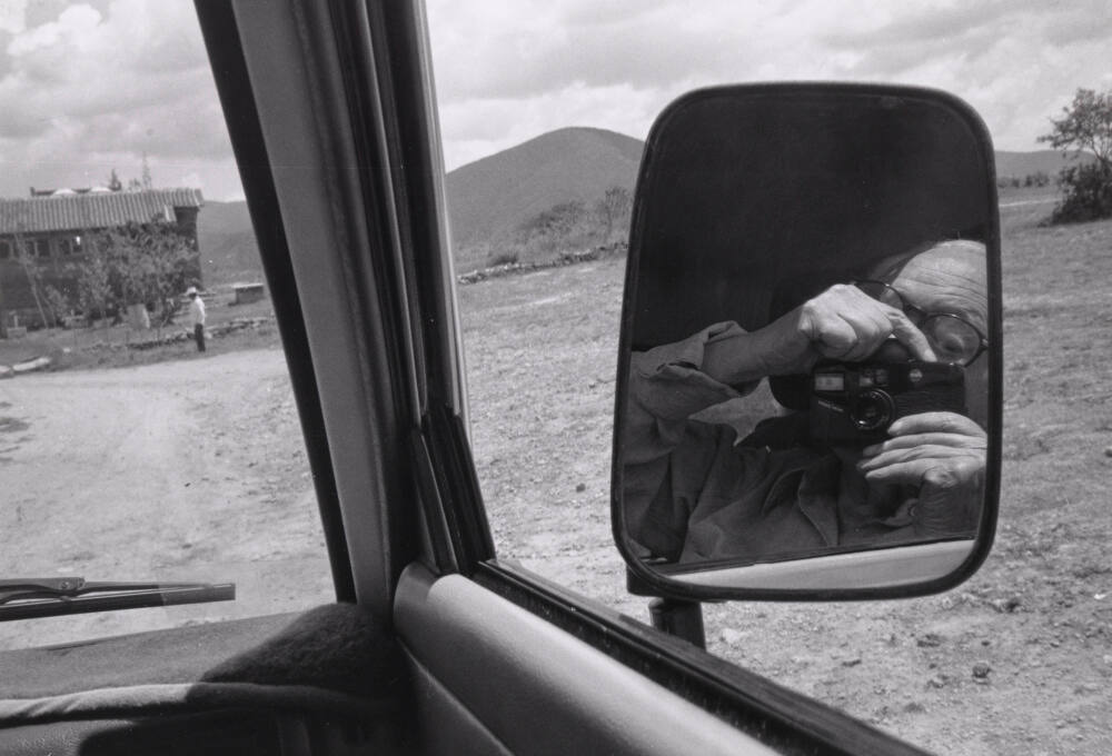DescriptionImage of a man wearing glasses holding a camera up to take a photograph of a dry landscape with a hill in the background a small figure center left. The man taking the photograph is seen through the vehicle's side mirror.Gallery LabelManuel Álvarez Bravo took this self-portrait at the age of 94 as he drove through the hills of Oaxaca, Mexico. The unusual composition divides the picture’s emphasis between his face and the surrounding landscape. Álvarez Bravo draws a connection between himself as an artist and rural Oaxaca, an area he photographed many times throughout his career. Though Álvarez Bravo rarely took self-portraits as a young man, he made this image just a few years before he passed away, a literal and metaphoric self-reflection near the end of his life.