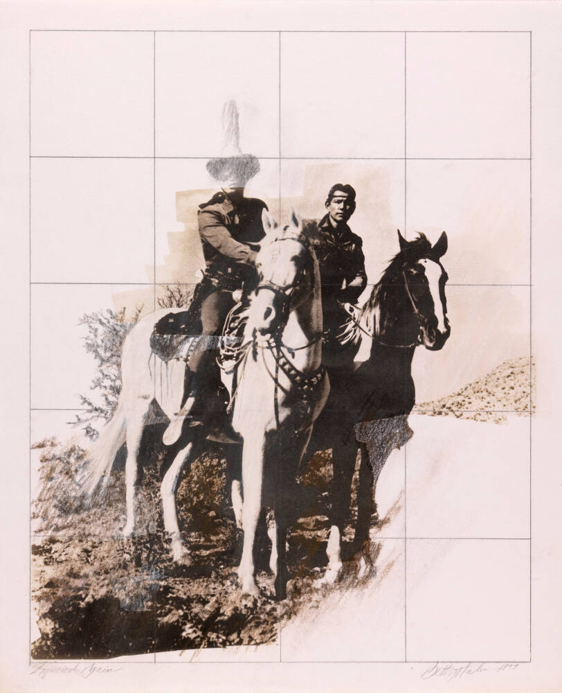 DescriptionImage of two men on horses; one wears a cowboy hat the other a narrow headband. The cowboy’s head is drawn in pencil, as are other portions of the image including a grid, which covers the entire image.ProvenancePurchased from Joseph Bellows Gallery, La Jolla, CA by The Hall Family Foundation, Kansas City, MO, 2017;