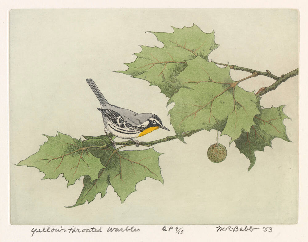 DescriptionThis print is a horizontally oriented color image. The image depicts a small bird (a Yellow-throated warbler) perched on a lone, thin branch extending from the right edge of the image toward the left. The bird is mostly gray, black, and white, with a yellow throat. There is a group of two leaves on the branch to the left of the bird and a group of three leaves to the right of the bird. A small, round fruit hangs from the branch below the group of leaves on the right. The background of the image is a solid, light green.Exhibition HistoryUnexpected Encounters, The Nelson-Atkins Museum of Art, June 2–August 12, 2018, no cat.