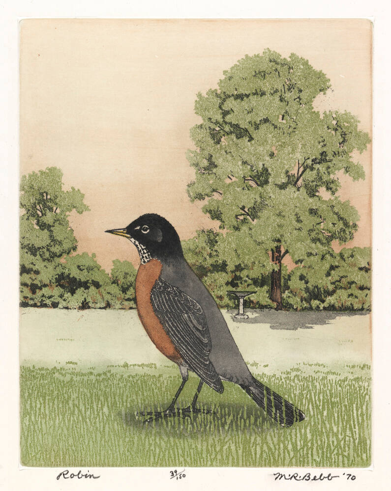 DescriptionThis print is a vertically oriented color image. The image depicts a robin (a common bird species) standing in profile, facing toward the left. The robin’s head, back, wings, tail, and legs are black, a darker shade on the head, tail, and legs. The bird’s beak is yellow, its throat white with black speckles, and its breast a brown orange. The robin stands in a green, grassy area. A line of green and brown trees runs along the horizon line in the background. A birdbath stands just in front of the trees, to the right of the robin. A light tan wash colors the sky behind the trees.Exhibition HistoryUnexpected Encounters, The Nelson-Atkins Museum of Art, June 2–August 12, 2018, no cat.