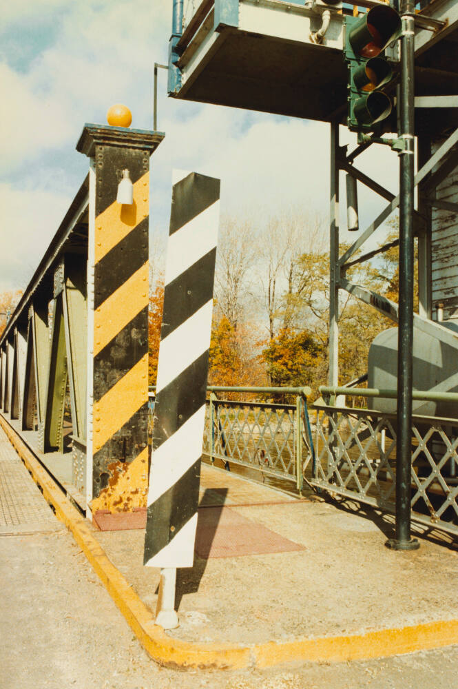 DescriptionImage of a pedestrian pathway along the side of a bridge. In the foreground are narrow striped road signs and a stop light. In the background is a body of water lined with fall colored trees.ProvenanceEstate of Michael Bishop;