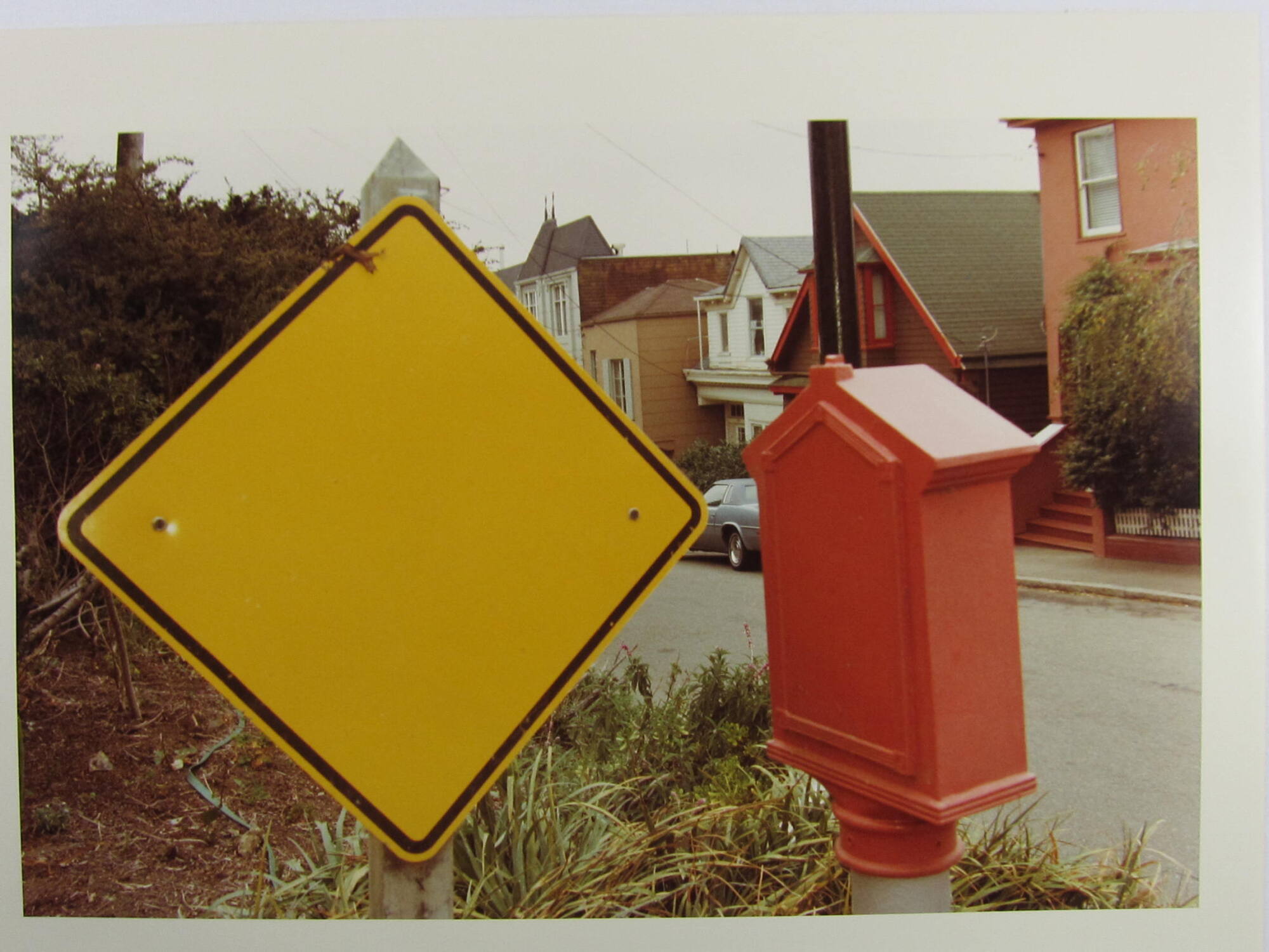 DescriptionImage of houses lining a street with a blank yellow traffic sign in the foreground.ProvenanceEstate of Michael Bishop;