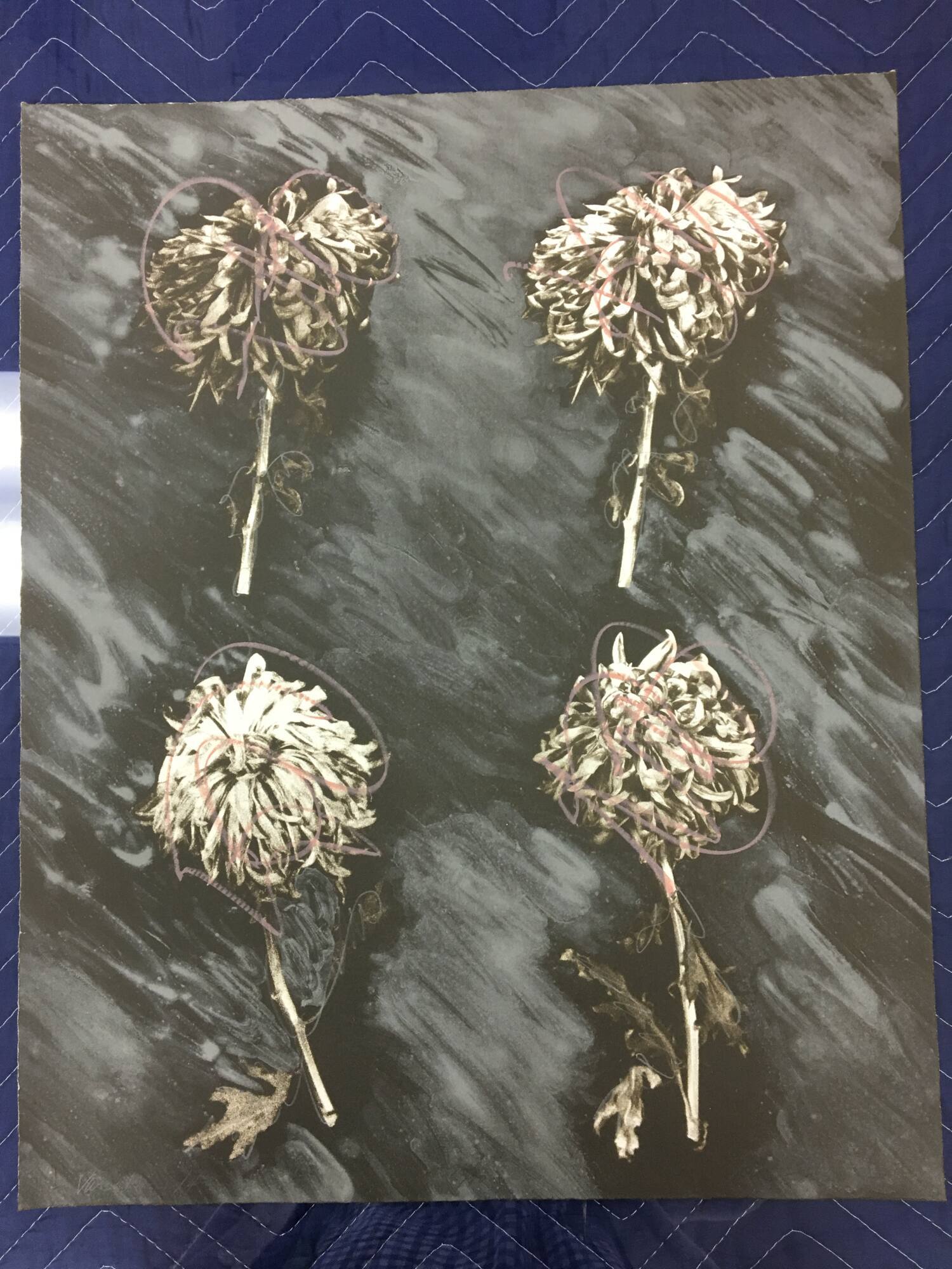 DescriptionImage of four chrysanthemums presented in two rows of two. The flowers have narrow stems and small leaves and are set against a black background with gray rubbings. Pink swirling marks appear on top of the white petals.Provenance
