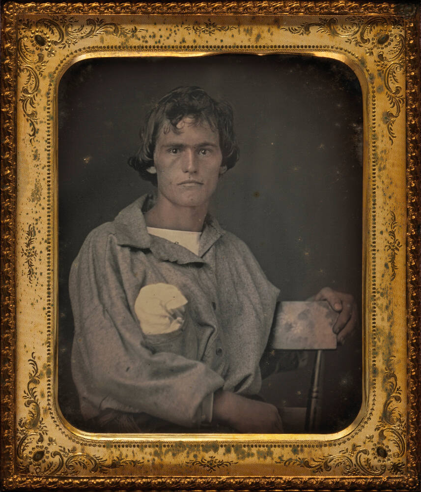 DescriptionImage of a man seated with left arm on chair back. He wears a collared shirt hand-tinted blue. He has a white pouch protruding from his pocket. This sixth plate daguerreotype is housed in a brass mat with a burgundy velvet liner inside of a decorative paper covered wooden case with metal clasp (broken spine). The case is decorated with a simple abstract motif and gold tooling along the perimeter.ProvenanceThe Hall Family Foundation, Kansas City, MO, 2017;